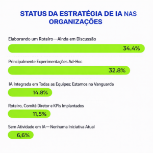 Em contrapartida, 14,8% das instituições afirmam que a IA está integrada em todas as suas equipes, ao passo que 11,5% apresentam um nível de maturidade mais elevado, com a existência de comitês, KPIs e uma agenda que inclui um roadmap estruturado. Esses dados indicam que a vantagem competitiva ainda é um recurso restrito a um número limitado de empresas que conseguiram transformar a tecnologia em uma autêntica competência organizacional, em vez de apenas uma estratégia de gestão do conhecimento.