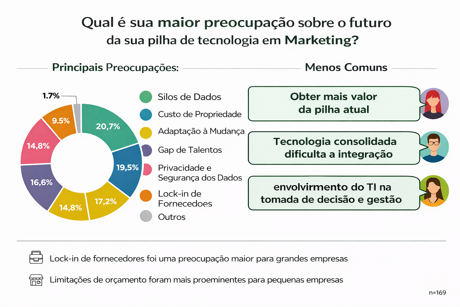 As questões relacionadas à stack martech voltaram a surgir quando a Pesquisa State of Your Stack de 2025 questionou sobre as principais preocupações para o futuro. Nesta ocasião, a principal preocupação foi com os silos de dados, seguida pelo custo de posse e pela adaptação às mudanças.